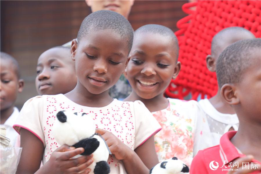 儿童村的孩子们收到维和医疗队队员送来的礼物(吕强 摄)