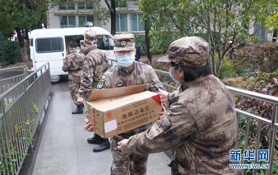1月26日,在武汉市金银潭医院,陆军军医大学医疗队在搬运物资。 当日,解放军援汉医疗队在武汉全面展开救治工作。陆军军医大学医疗队成建制接管武汉市金银潭医院两个病区。 经中央军委批准,解放军从陆军、海军、空军军医大学抽组3支医疗队。其中,陆军军医大学医疗队在金银潭医院接管两个病区;海军军医大学医疗队在汉口医院全面接管重症监护室,新开设了呼吸科病区;空军军医大学医疗队进驻武昌医院,按照重症救治、收治病房、发热门诊、检验和放射检查等环节进行了人员配置。 他们所进驻的3所医院,是武汉地区指定接诊新型冠状病毒感染的肺炎病例较多的地方医院,医护人员承受巨大压力。 新华社记者 程敏 摄