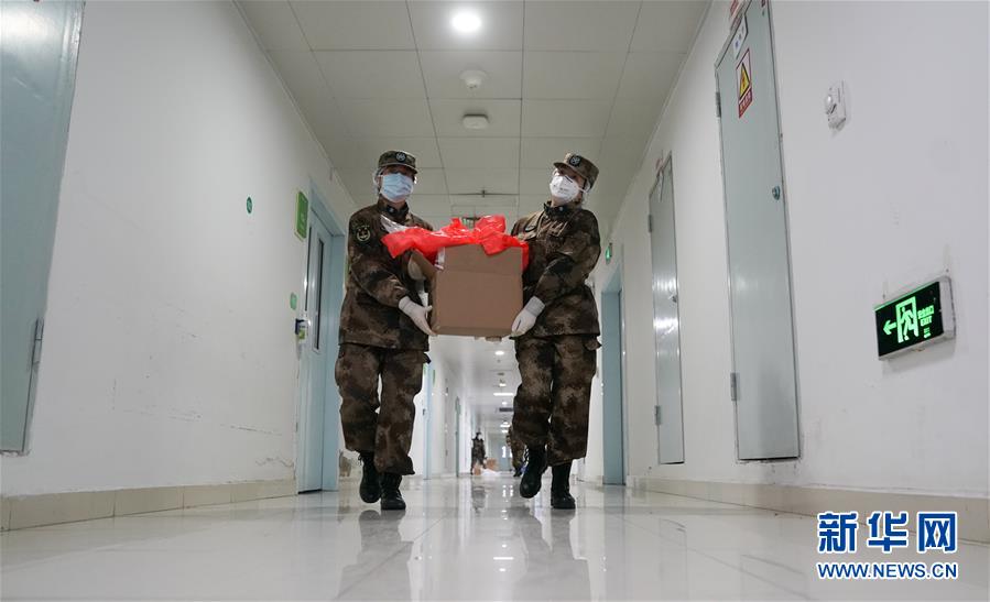1月26日,在武汉市金银潭医院,陆军军医大学医疗队在搬运物资。 当日,解放军援汉医疗队在武汉全面展开救治工作。陆军军医大学医疗队成建制接管武汉市金银潭医院两个病区。 经中央军委批准,解放军从陆军、海军、空军军医大学抽组3支医疗队。其中,陆军军医大学医疗队在金银潭医院接管两个病区;海军军医大学医疗队在汉口医院全面接管重症监护室,新开设了呼吸科病区;空军军医大学医疗队进驻武昌医院,按照重症救治、收治病房、发热门诊、检验和放射检查等环节进行了人员配置。 他们所进驻的3所医院,是武汉地区指定接诊新型冠状病毒感染的肺炎病例较多的地方医院,医护人员承受巨大压力。 新华社记者 程敏 摄