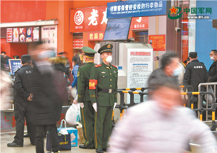 1月24日,武警重庆总队执勤第二支队官兵在重庆陈家坪汽车站执勤。穆洪超摄