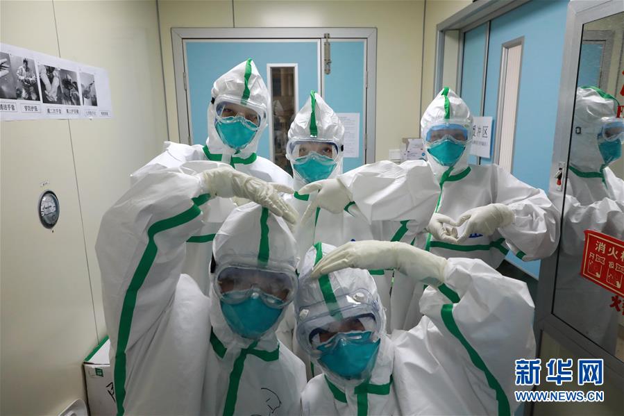 1月30日,海军军医大学医疗队重症监护室医护人员在进入ICU前合影。新华社发(陈晨 摄)