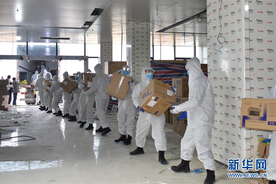 1月29日,武警湖北总队黄冈支队官兵为担负隔离任务的大别山区域医疗中心抢运物资。 新华社发(龚诚 摄)