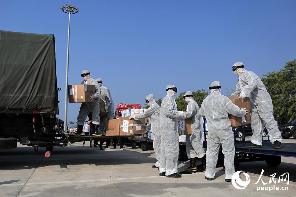 武警官兵在三亚凤凰机场搬运防疫物资。