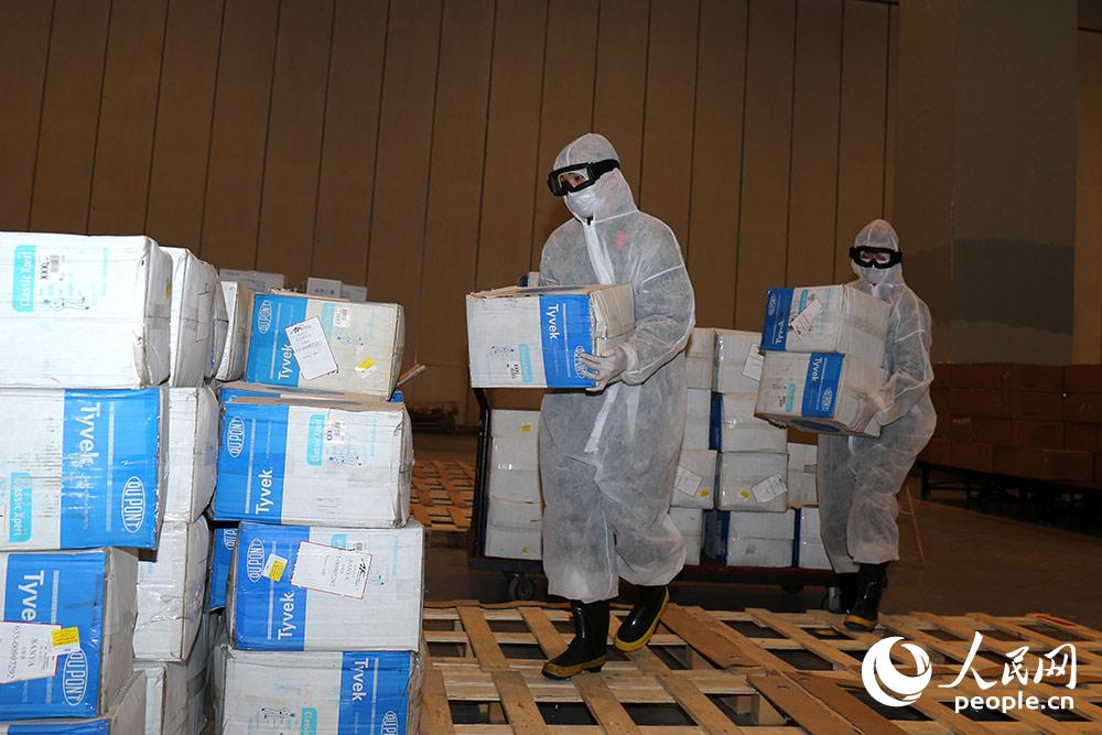 武警官兵将防疫物资运动至指点仓库并摆放整齐。