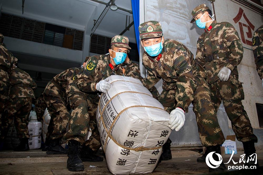 广西南宁:武警官兵紧急搬运300余吨疫情防控救援物资
