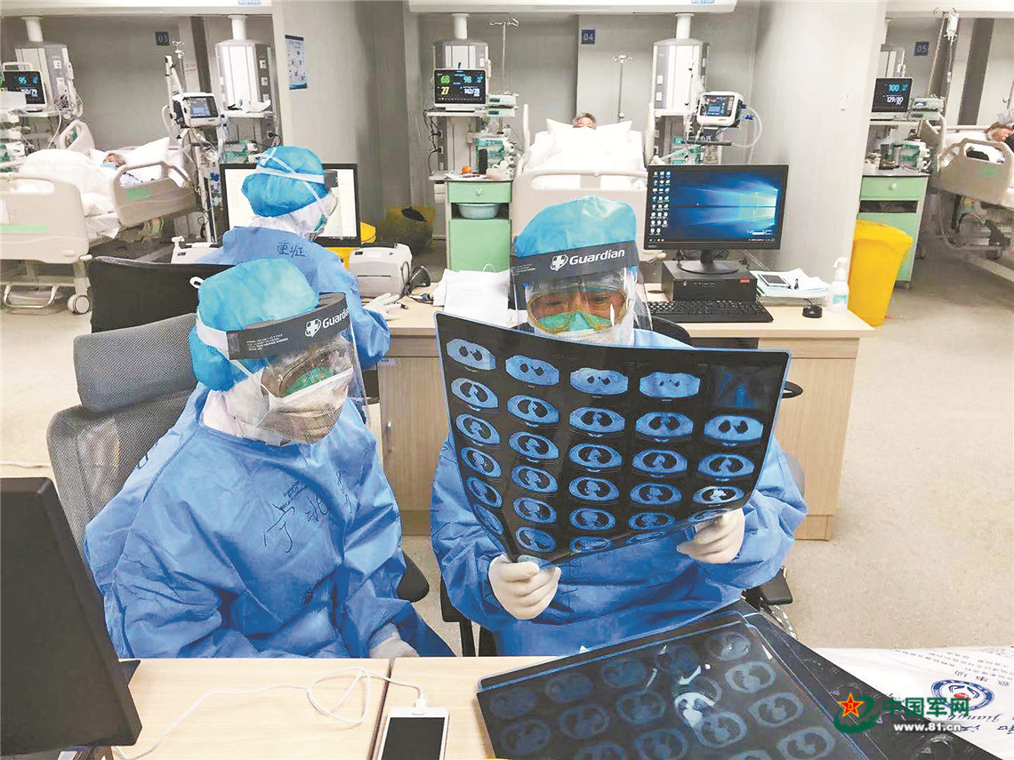 2月11日,火神山医院重症医学科一科副主任李文放(右)与同事研究分析重症患者病情。