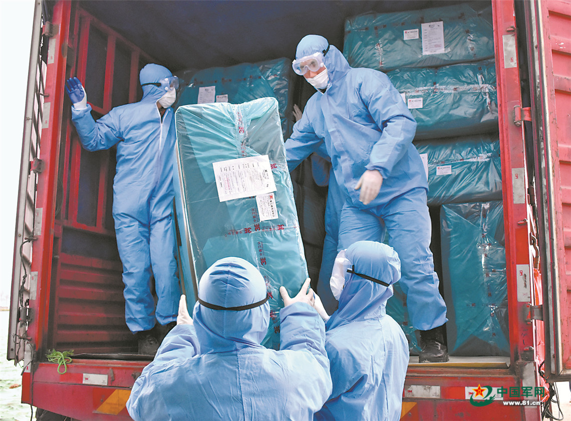 2月10日,武警湖北总队黄冈支队官兵为担负隔离任务的大别山区域医疗中心抢运急需物资。