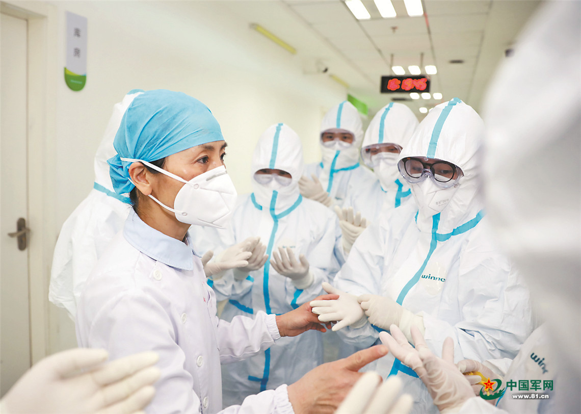 2月7日,中部战区总医院神经内科护士长刘孟丽(左一),向将要进入治疗区工作的护士交代注意事项。