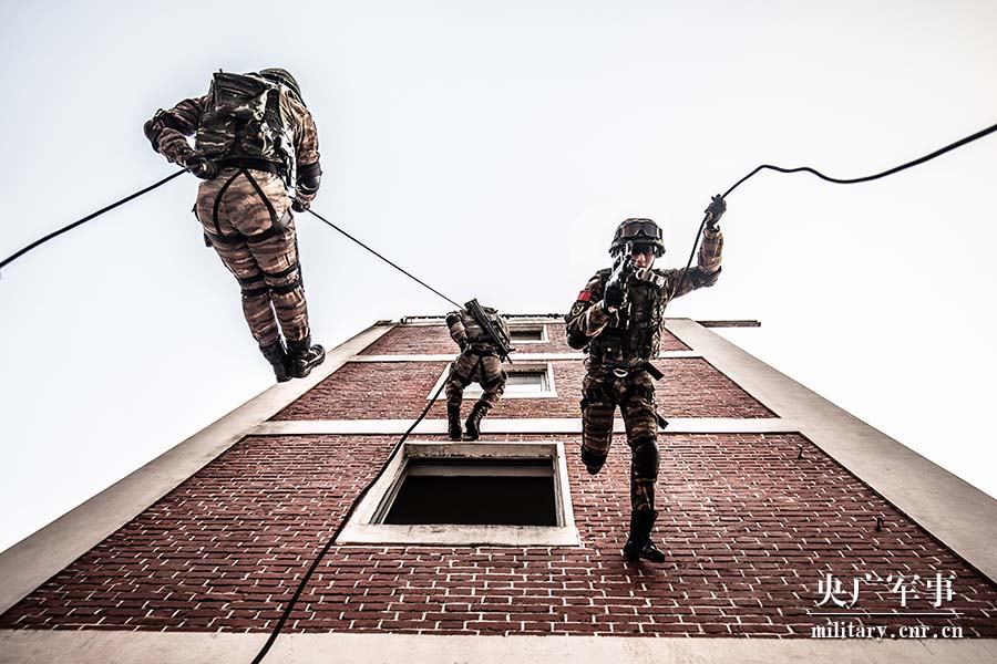参训特战队员快速从目标楼顶索降至指定区域