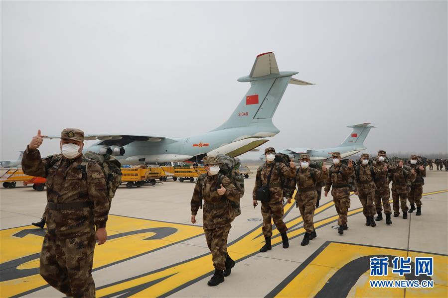 2月2日,军队医疗队乘军机抵达武汉天河机场,队员们竖起大拇指为武汉加油。新华社发(龙德勇 摄)