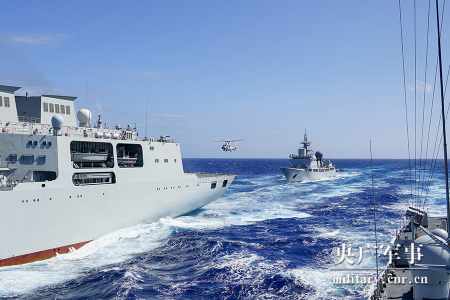 在编队上空,担任警戒任务的舰载直升机视情况降落在查干湖舰的后甲板上,并迅速装载雷弹返回呼和浩特舰,成功实施空中垂直补给。