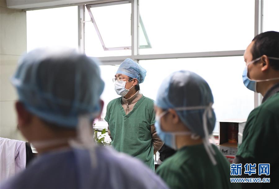 2月1日,在重庆三峡中心医院新冠肺炎隔离病区,崔勇组织医护人员进行交接班会议。新华社记者王全超摄
