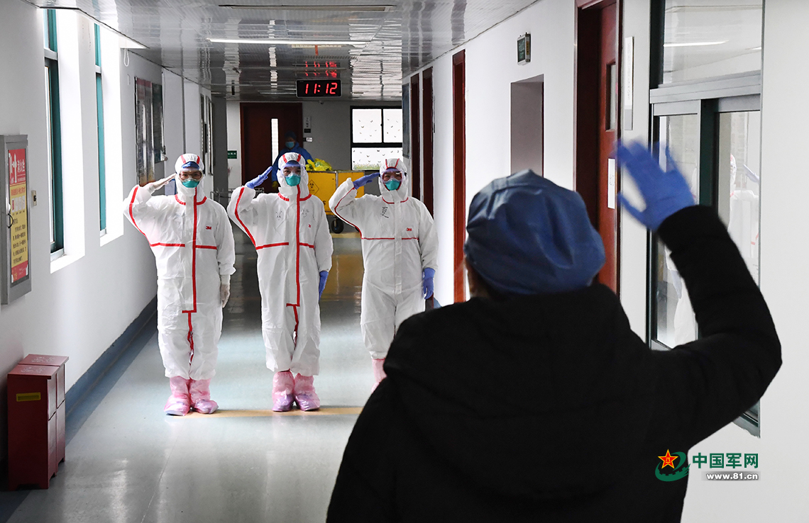 一名患者治愈出院,患者与医护人员道别。解放军报记者王传顺 摄