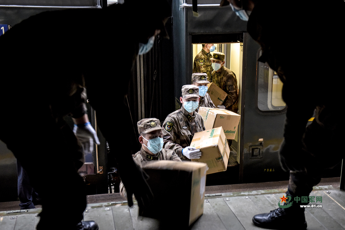 1月26日上午,全军首批从辽宁沈阳、山东菏泽紧急调拨卫生物资抵达武汉,军队前方指挥协调组协调军地双方进行物资交接。图为官兵在汉口火车站迅速搬运物资。解放军报记者 范显海 摄