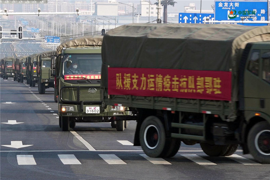 驻鄂部队运力支援队向武汉市各网点调运生活物资。(粟毅 摄)
