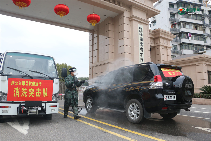 该省军区组织官兵在营门对进出车辆进行洗消。(粟毅 摄)