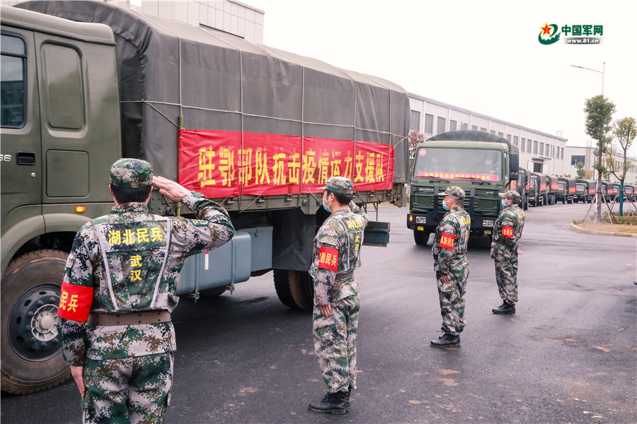 连日来,为确保武汉市民正常生活供应,武汉警备区组织民兵协助驻鄂部队抗击疫情运力支援队编队前往武汉各配送中心装载调运生活物资。(洪培舒 摄)