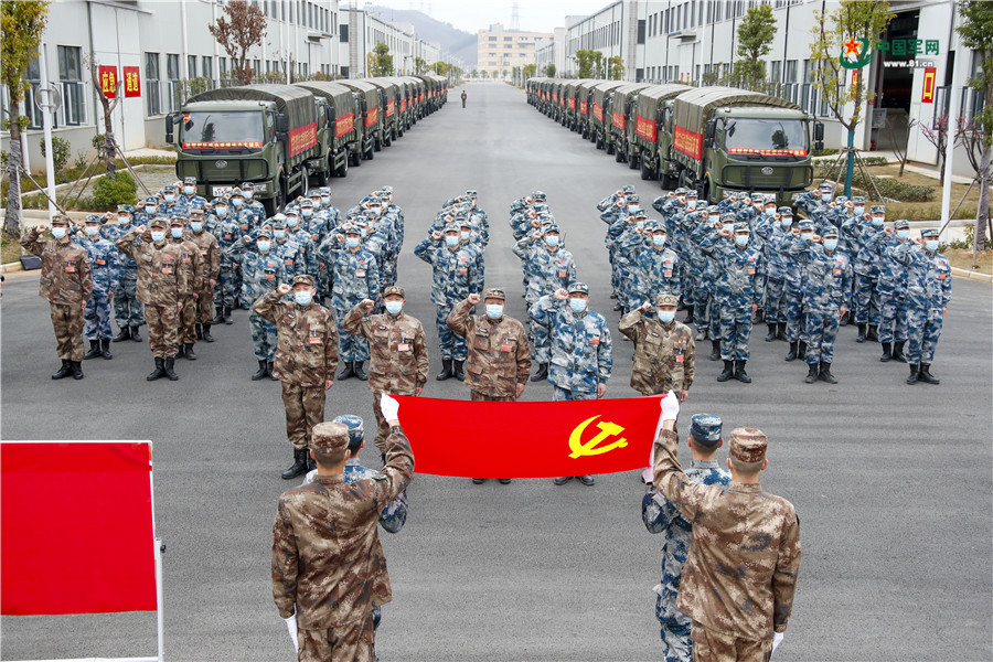 驻鄂部队抗击疫情运力支援队举行首批火线入党仪式。(粟毅 摄)