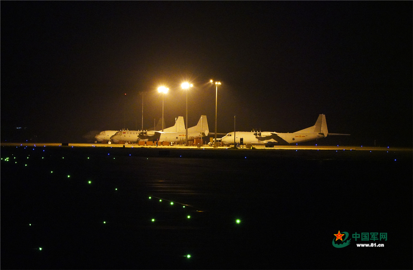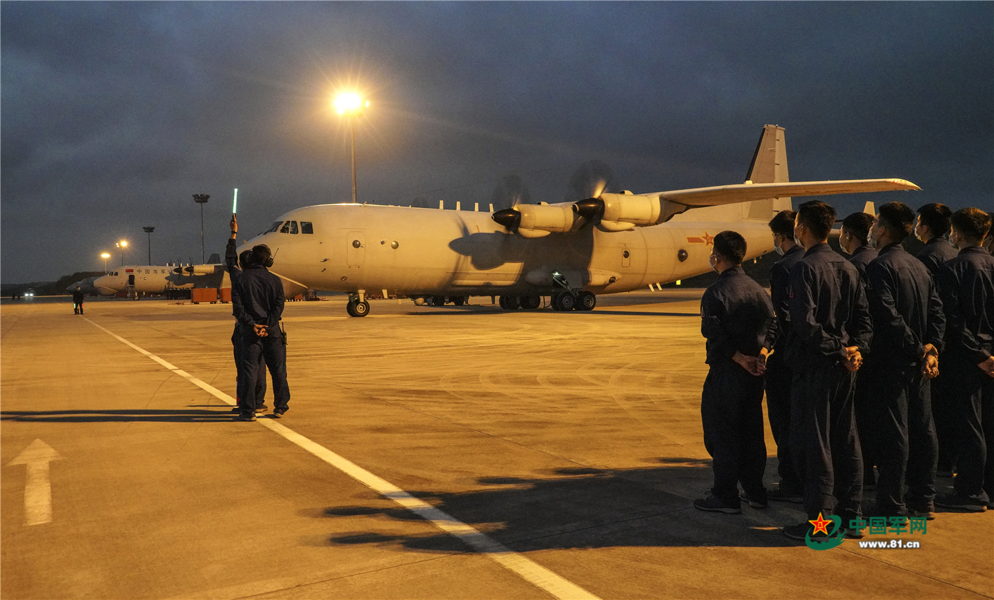 夜幕时分,地勤官兵放飞战机进行新一轮的飞行训练。