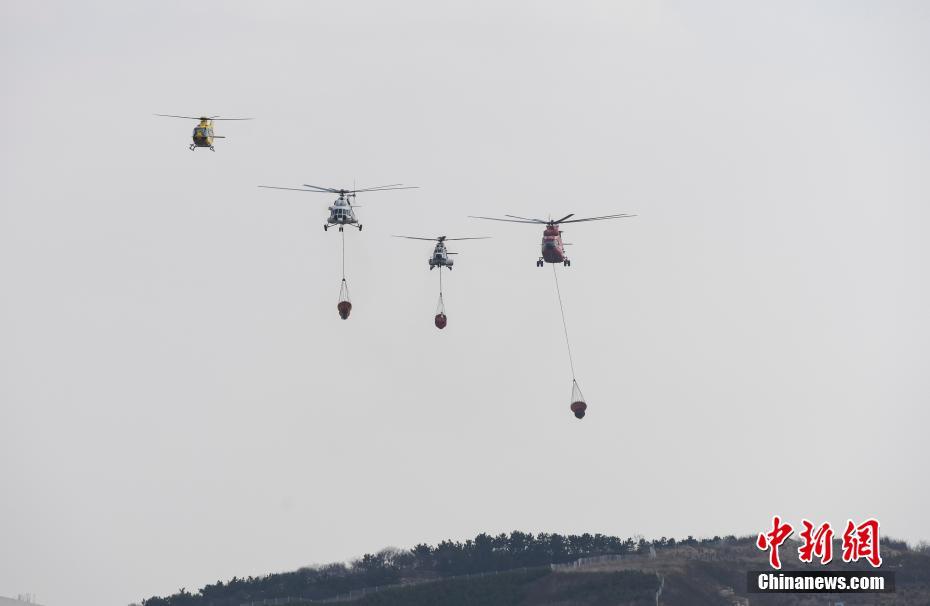 3月10日,直升机编队进行挂吊桶飞行“灭火”训练。当日,山东省森林航空消防莱芜基地举行救援直升机编队联训,提升直升机吊桶飞行“灭火”能力。中新社记者 张勇 摄