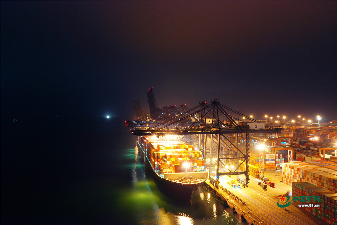 夜晚的深圳盐田港一派灯火通明景象,这是装满集装箱后等待出港的货船(无人机航拍)。