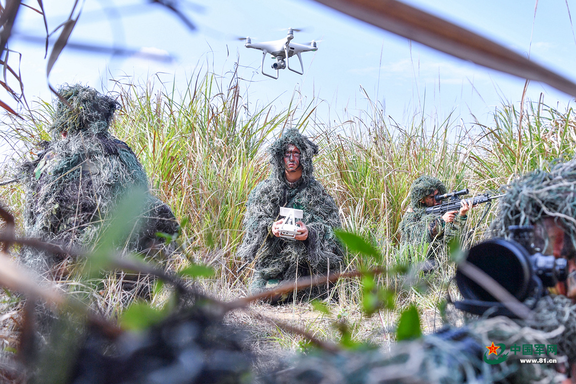 侦察兵利用无人机进行目标侦察搜索训练。