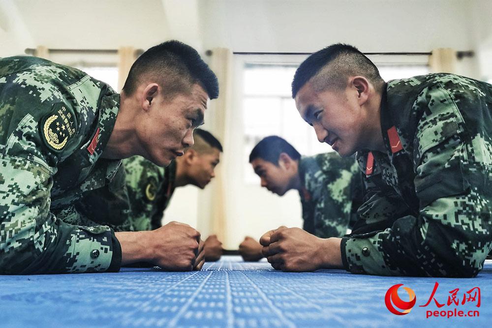 中队列兵张孝平向班长尚富顺发起“平板支撑”挑战。
