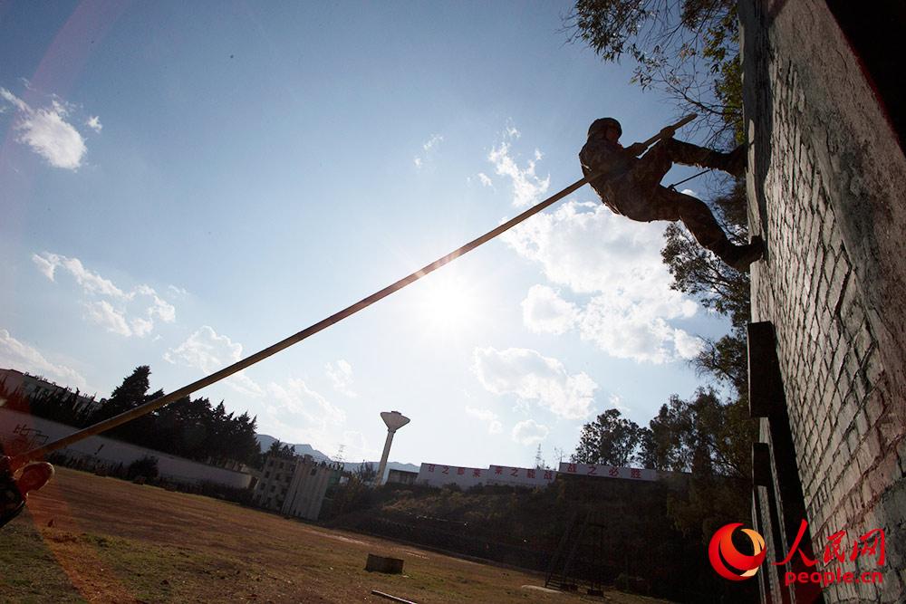 特战队员进行协作攀登。