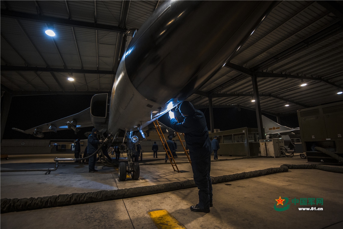 机务官兵精心检查即将升空的战鹰。