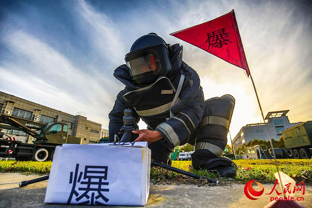 排爆手利用爆炸物销毁器摧毁“爆炸物”。