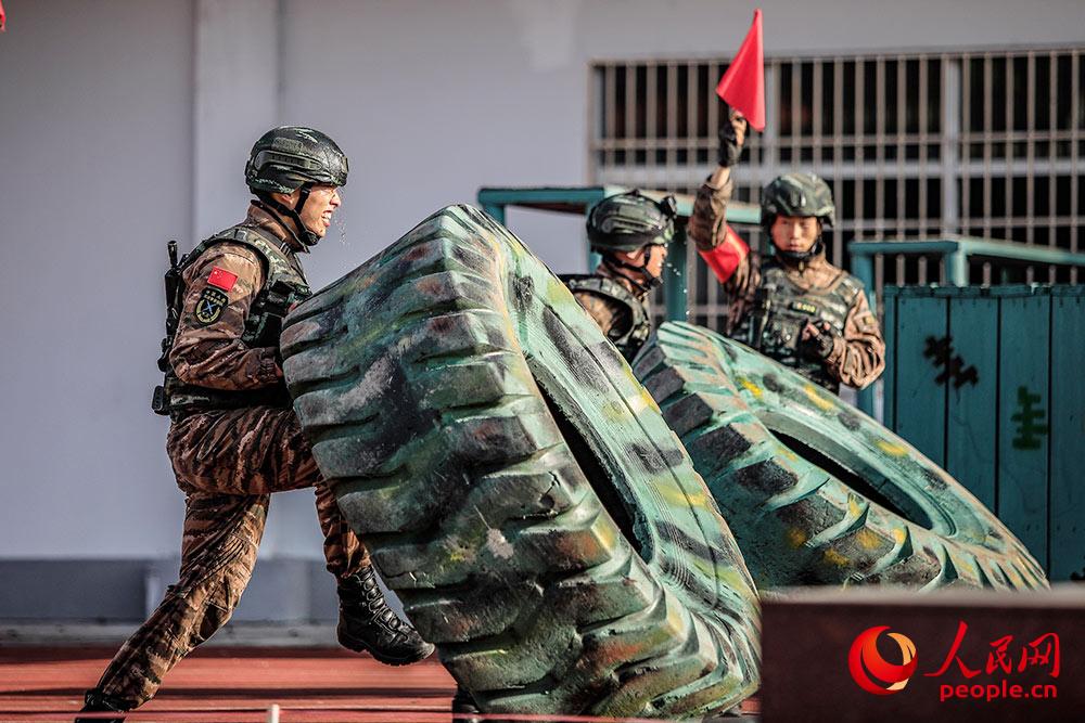 “五能合一”综合体技能训练特战队员正在翻动上百斤的轮胎。