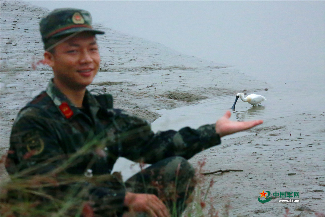 3月31日,深圳红树林生态保护区内,一只黑脸琵鹭与执勤间隙的武警官兵悄然同框,相映成趣。