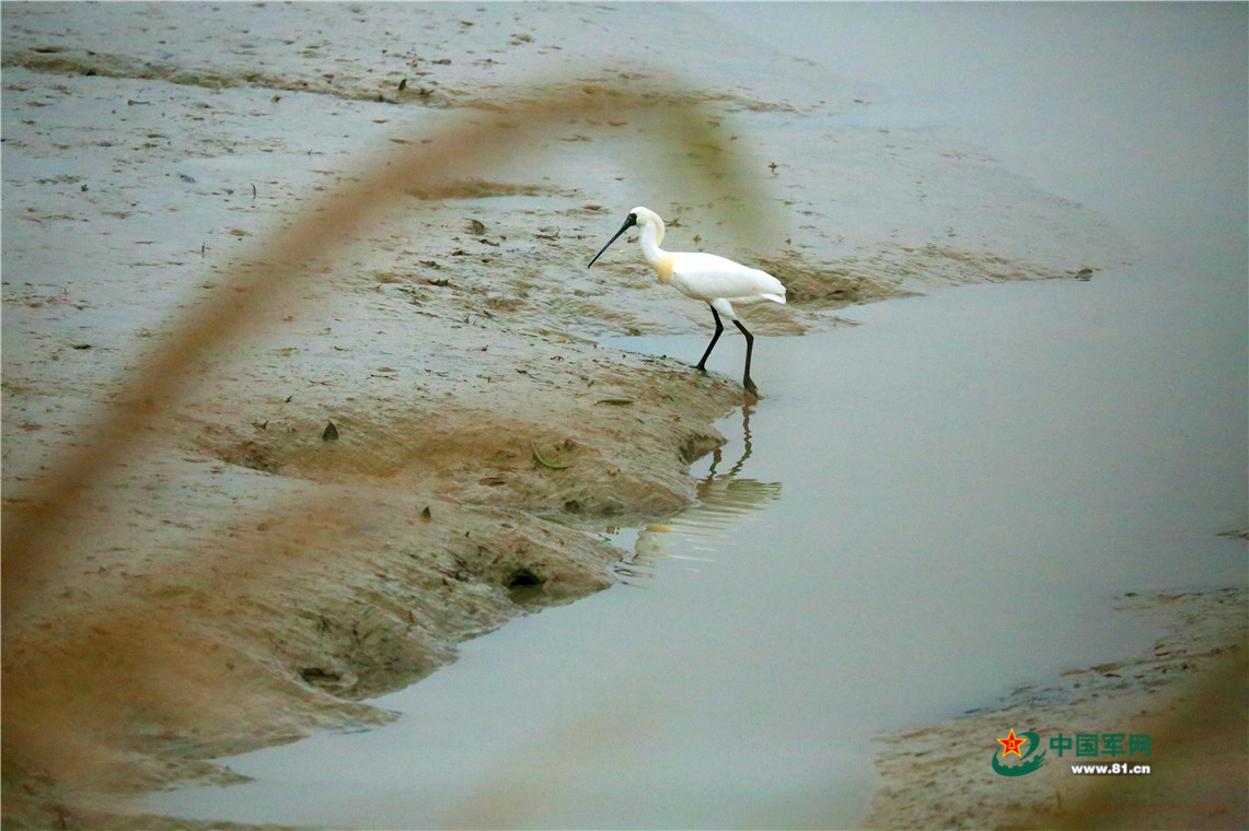 3月31日,深圳红树林生态保护区内,一只黑脸琵鹭在觅食中。