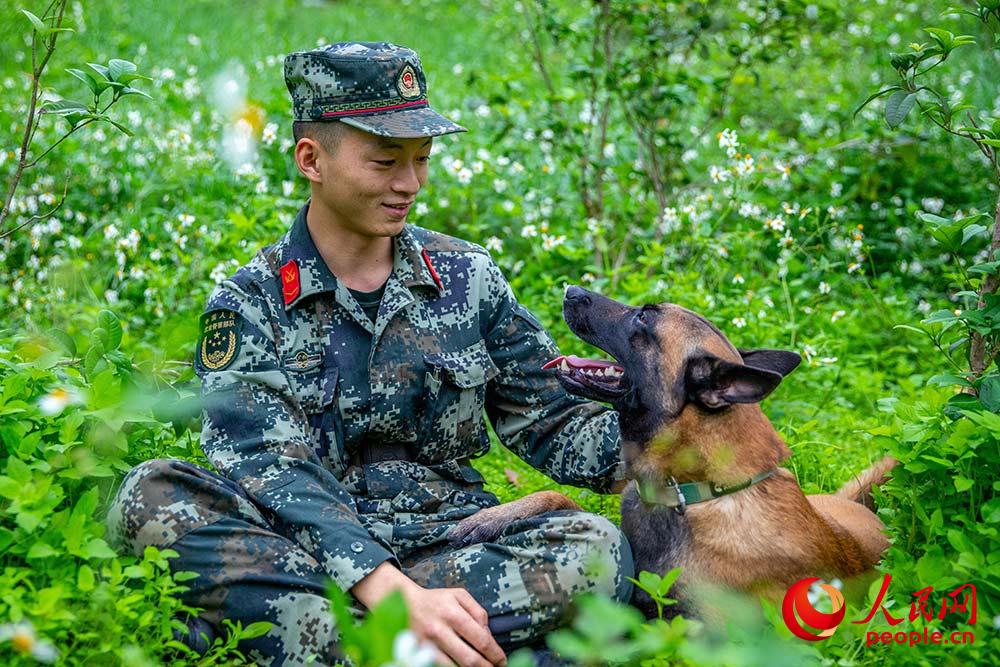 离开墓园后,驯导员孔德鑫安抚着军犬“拉克”。