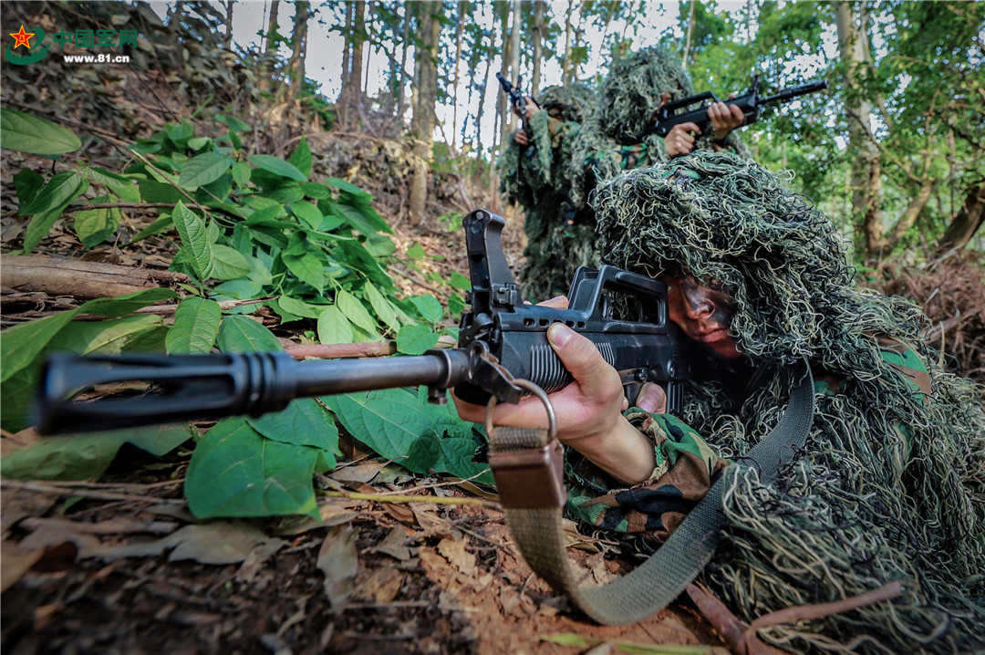 一名特战队员掩护队友搜索追击目标。