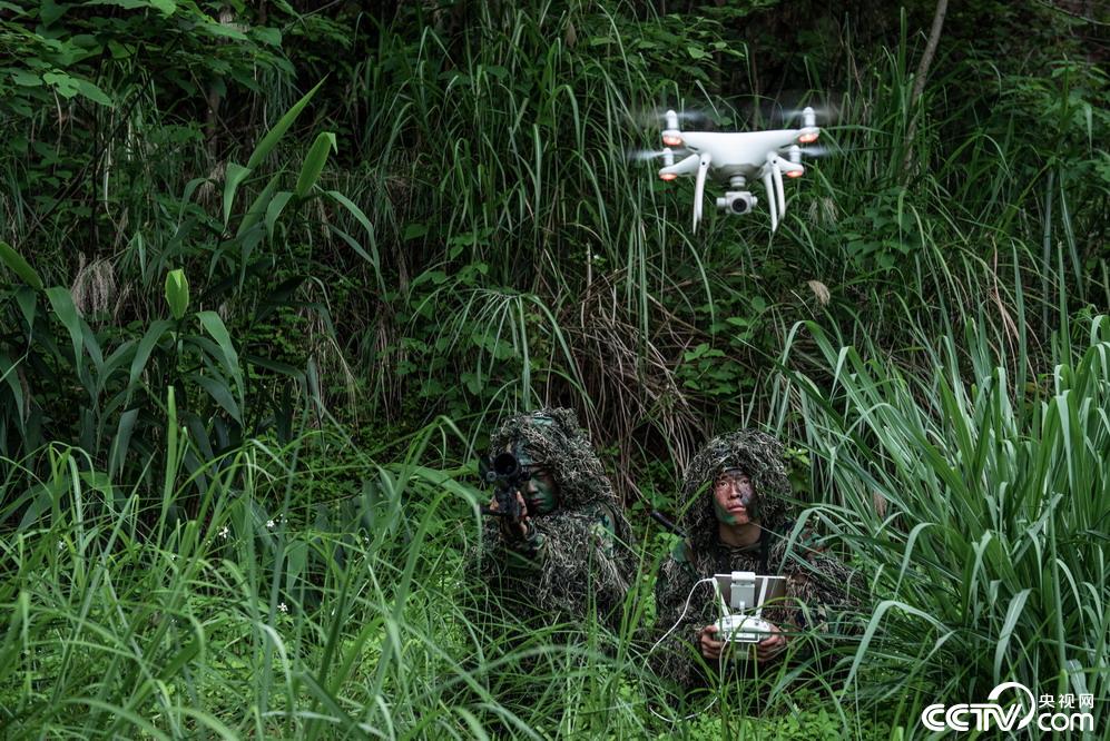 协同狙击训练中,乐聚(右)和许海鹏(左)利用无人机判定射击方位。