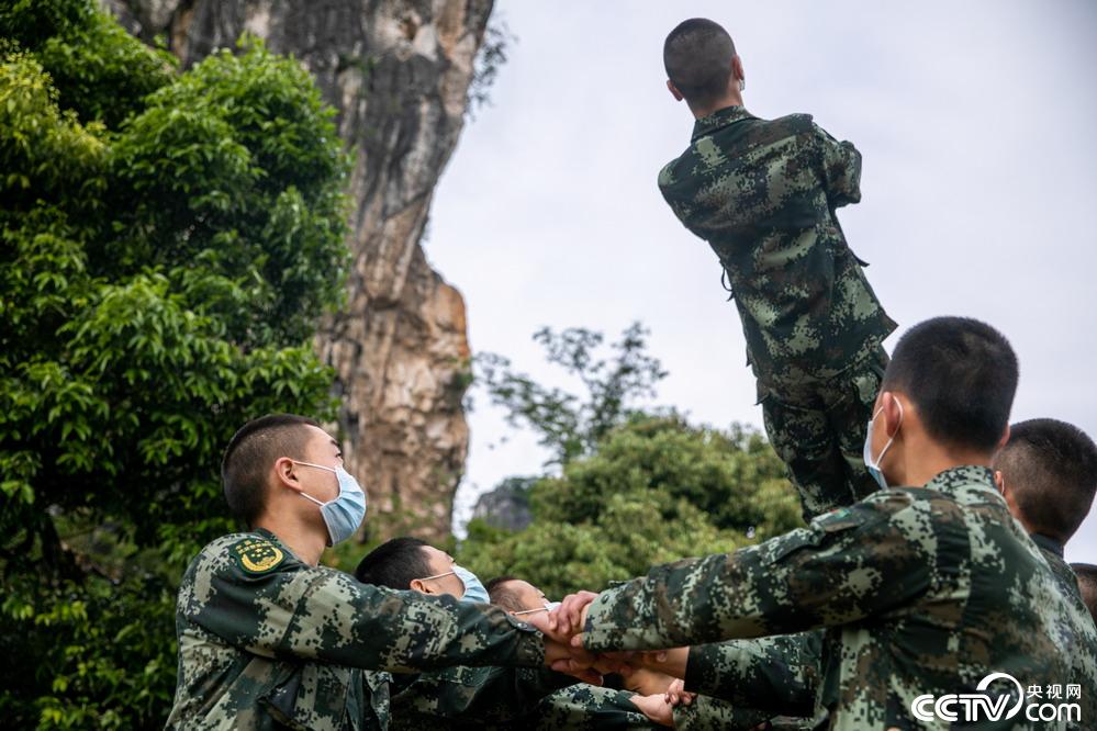 战士们开展信任背摔训练。