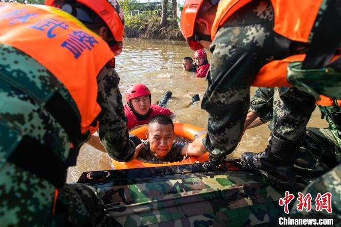 图为武警官兵和消防队员将“受困群众”转移至皮艇。 张宸硕 摄