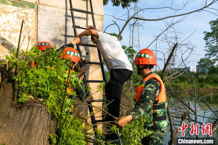 图为武警官兵搭设救援梯转移群众。 张宸硕 摄