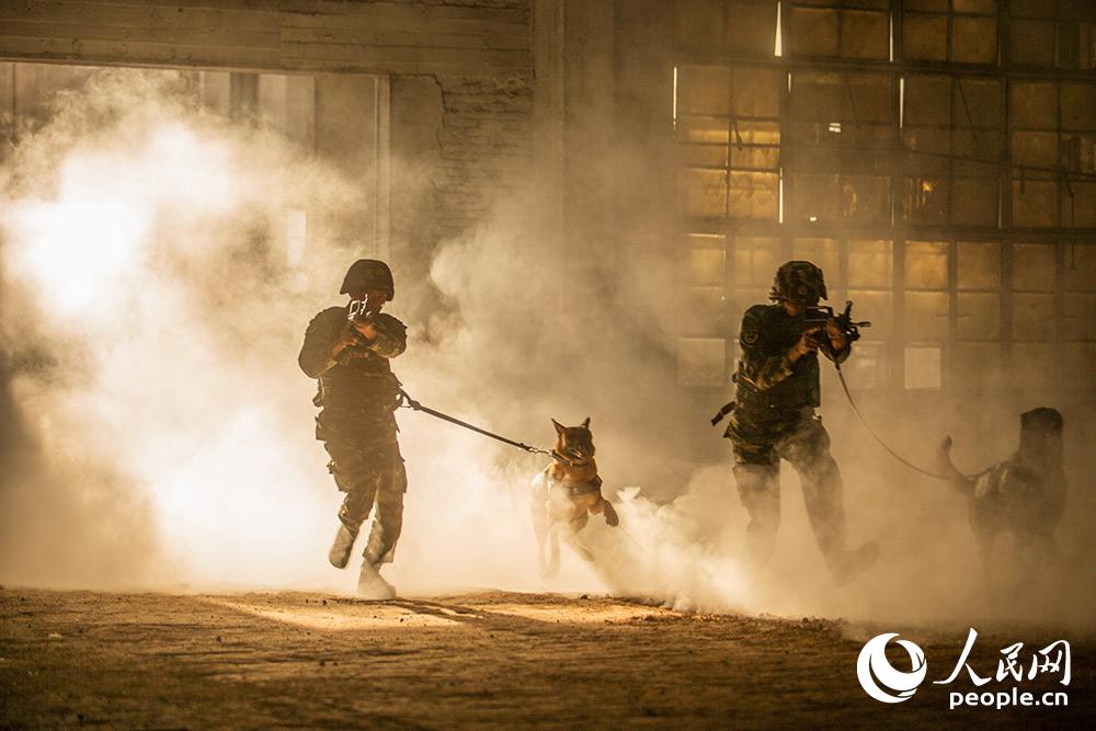 警犬与训导员进行人犬协同战术训练。