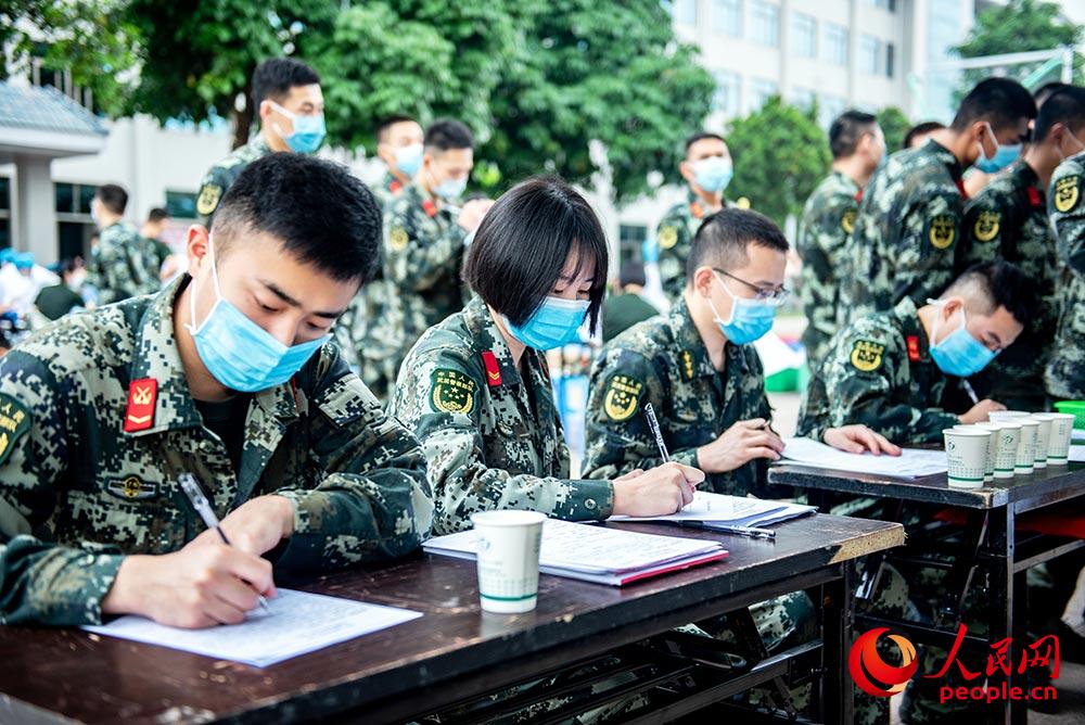 武警官兵正在填写血样采集单。