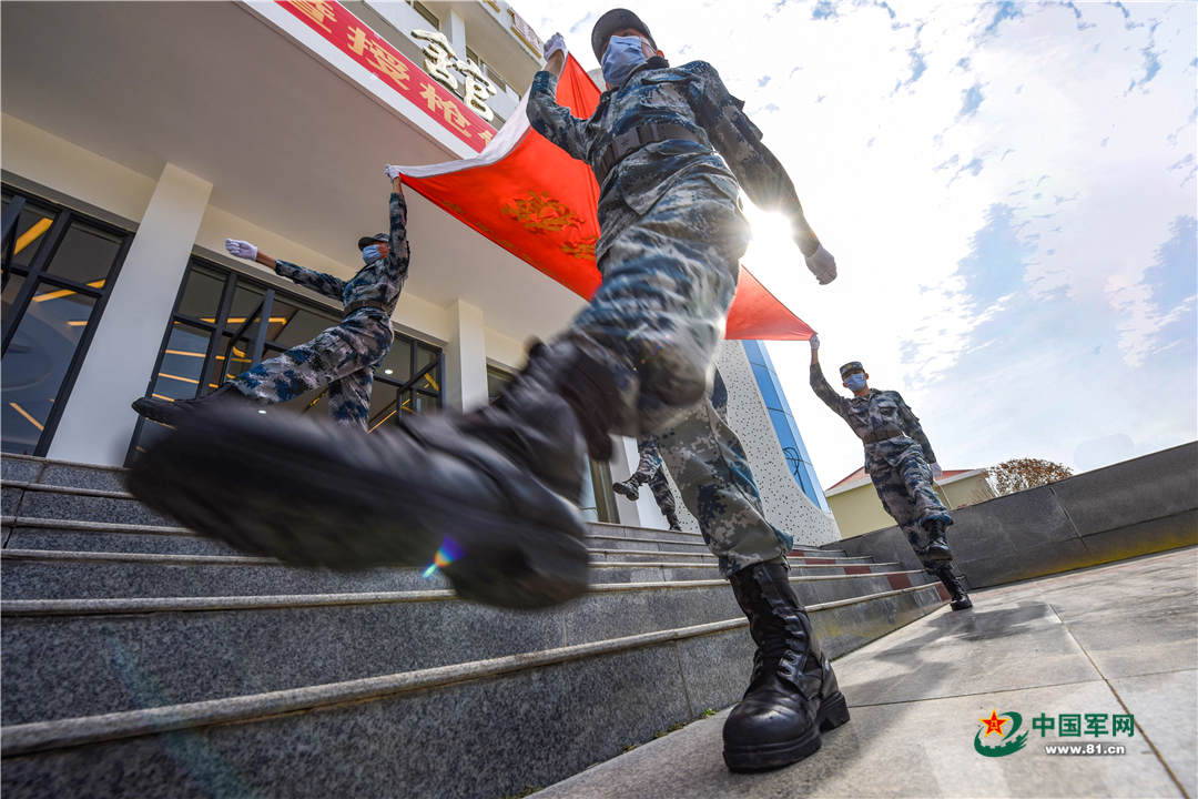 礼兵迎“模范空降兵连”连旗入场。谢程宇摄