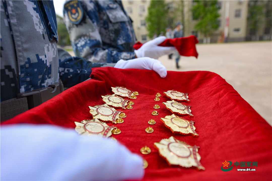 为新兵佩戴荣誉勋章。谢程宇摄