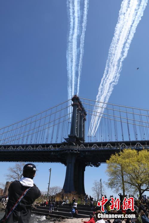 当地时间4月28日, 美国空军“雷鸟”和海军“蓝天使”特技飞行表演队飞越纽约上空向抗击新冠肺炎的一线医护人员致敬。中新社记者 廖攀 摄