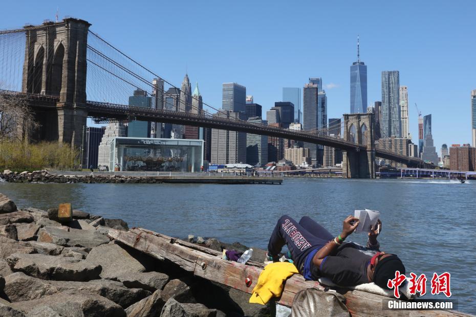 当地时间4月28日,一位市民在纽约布鲁克林大桥下戴着口罩看书。据美国约翰斯·霍普金斯大学实时统计数据,截至北京时间4月29日1时30分,美国新冠肺炎累计确诊病例已超过100万例。中新社记者 廖攀 摄