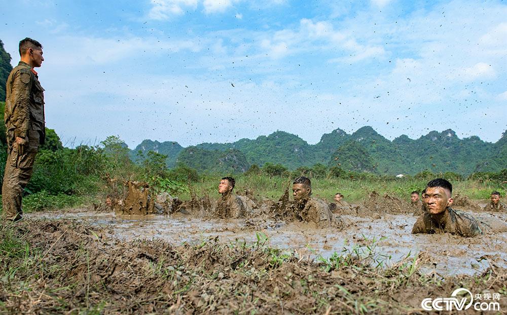 2020年5月6日,武警官兵在泥潭中进行倒功训练。