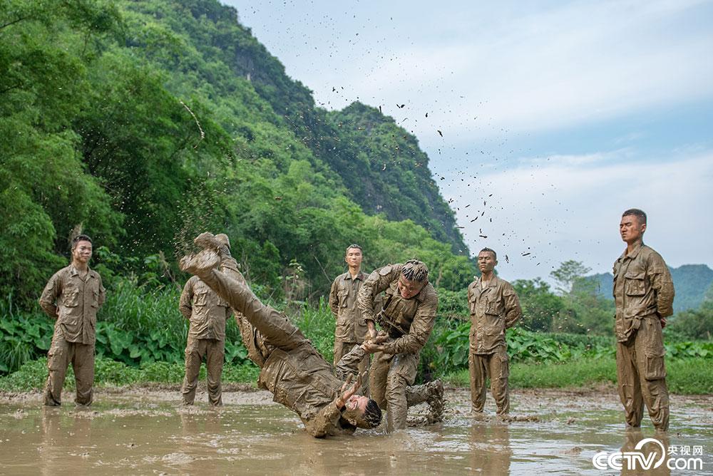 2020年5月6日,两名武警官兵在泥潭中进行擒敌对抗训练。