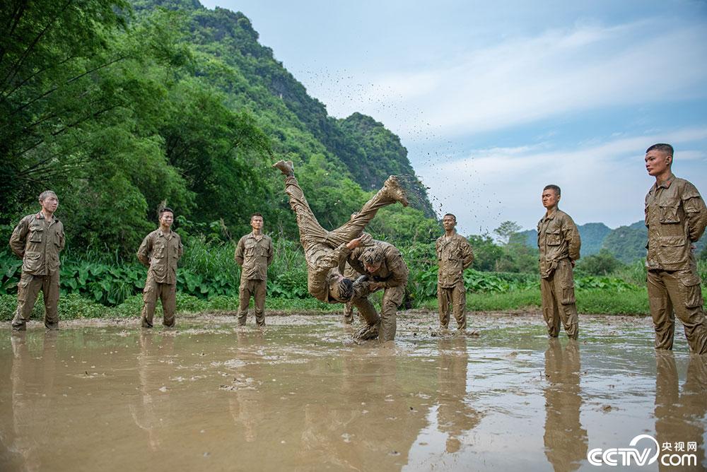 2020年5月6日,两名武警官兵在泥潭中进行擒敌对抗训练。