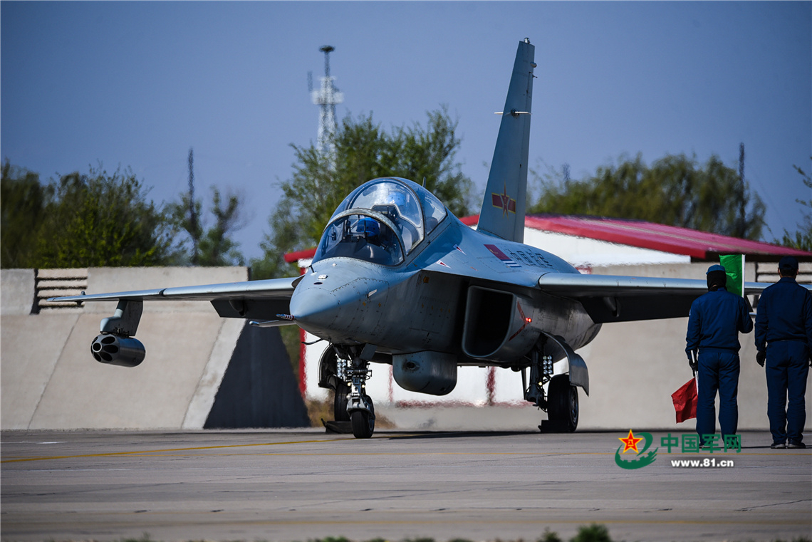 随着一枚绿色的信号弹升起,一架架齐装满挂的战鹰依次滑出,伴着巨大的轰鸣声直冲蓝天,呼啸着向靶场飞去。