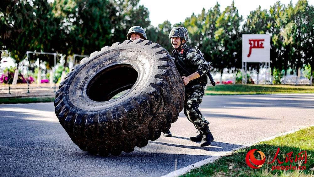 特战队员进行翻轮胎训练。